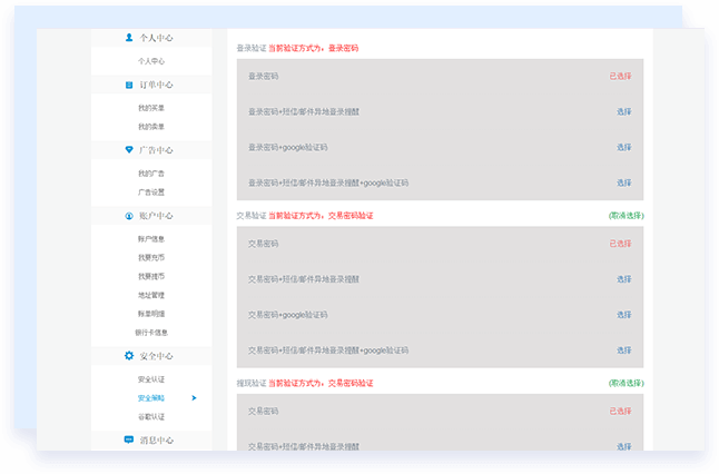 此外互融云OTC場(chǎng)外交易系統(tǒng)中還提供了多種付款方式,支持銀行卡、微信、支付寶三種方式,同時(shí),為了保證平臺(tái)用戶(hù)賬號(hào)安全性還提供了交易密碼、短信驗(yàn)證、google驗(yàn)證碼等多種安全策略校驗(yàn),通過(guò)多種功能和安全策略的結(jié)合為交易雙方保駕護(hù)航。
