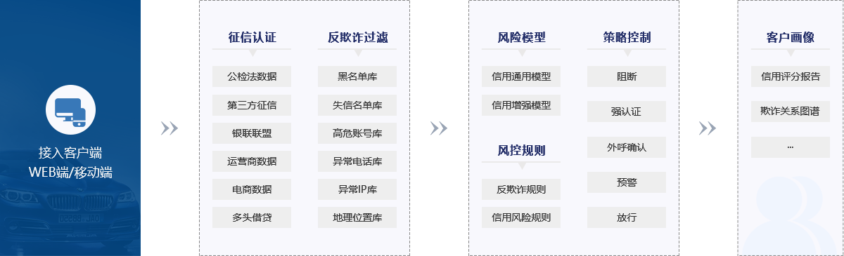 1、個(gè)人信用風(fēng)險(xiǎn)評(píng)估:人行征信、實(shí)名認(rèn)證、借款人信息詳情、反欺詐驗(yàn)證。