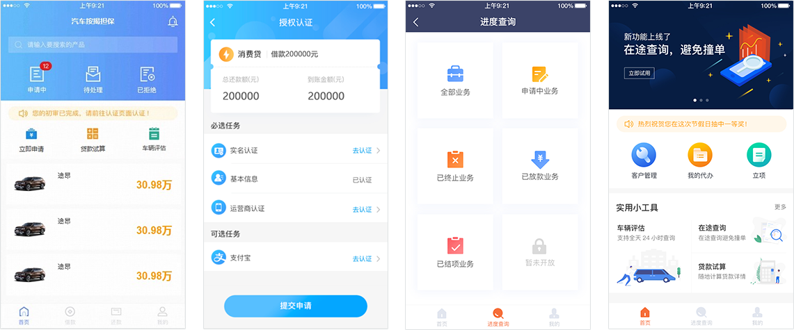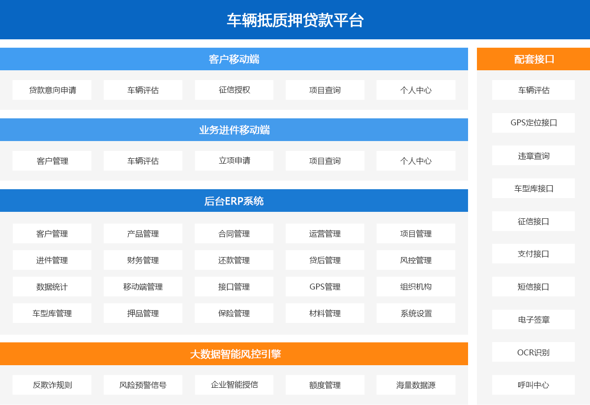 互融云汽車按揭擔(dān)保系統(tǒng)集合客戶管理、經(jīng)銷商管理、產(chǎn)品管理、審核流程管理、資料管理、風(fēng)控模型、車輛評(píng)估、合同管理、財(cái)務(wù)管理、逾期催收、保后管理、車輛管理、GPS定位、車輛變現(xiàn)、數(shù)據(jù)統(tǒng)計(jì)等功能模塊,針對(duì)汽車金融擔(dān)保公司推出的撮合購(gòu)車人和貸款銀行的汽車消費(fèi)貸款系統(tǒng),側(cè)重助貸業(yè)務(wù)流程管理。通過(guò)先進(jìn)的互聯(lián)網(wǎng)技術(shù),幫助擔(dān)保公司從容高效的管理客戶和經(jīng)銷商信息及汽車消費(fèi)貸款的助貸擔(dān)保流程,幫助企業(yè)降低運(yùn)營(yíng)成本和風(fēng)險(xiǎn)成本。