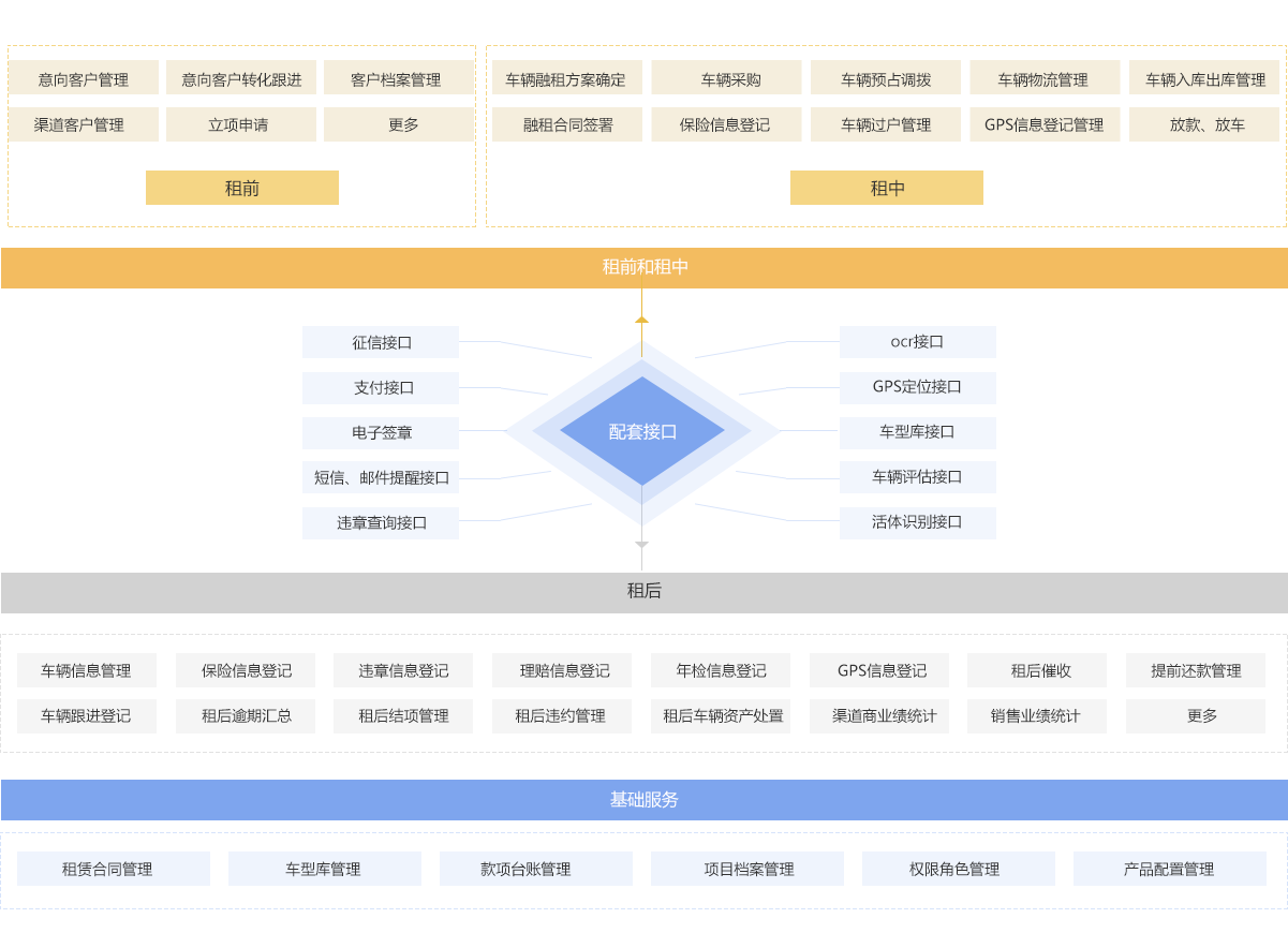 系統(tǒng)開展租前、租中、租后業(yè)務(wù)流轉(zhuǎn)過程中,通過引入多家三方集成,提高業(yè)務(wù)的運營效率。
