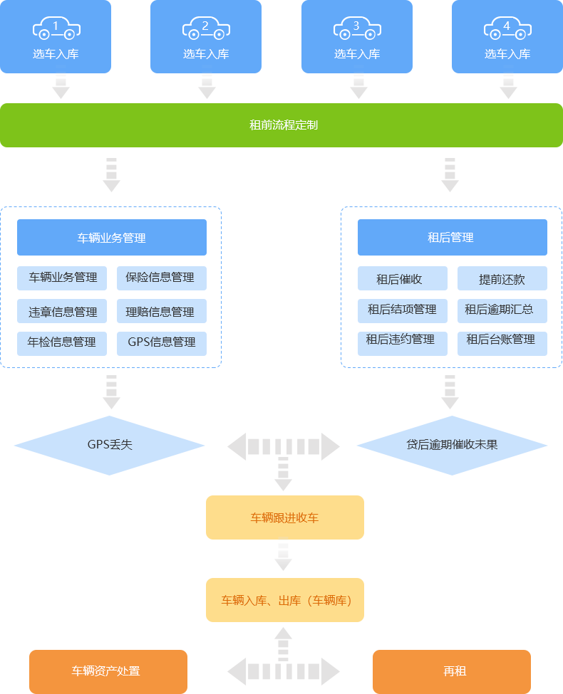 系統(tǒng)支持租賃車輛全流程化管理,整個車輛的融資租賃業(yè)務(wù)正常業(yè)務(wù)線、非正常業(yè)務(wù)線流程都形成閉環(huán)管理。
