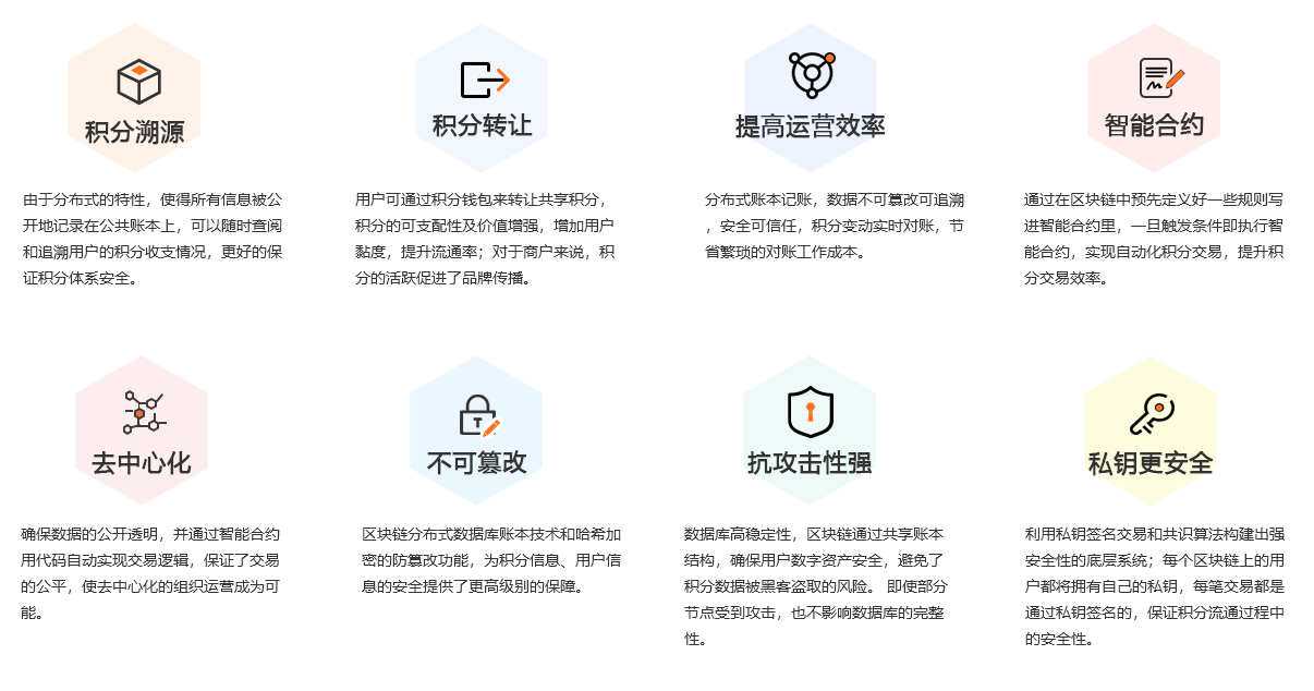 此外,區(qū)塊鏈作為一種不可篡改的分布式數(shù)據(jù)庫賬本技術(shù),擁有共享賬本結(jié)構(gòu)、私鑰簽名交易和共識算法等技術(shù)特點,其存儲的數(shù)據(jù)分布于網(wǎng)絡(luò)的每一個節(jié)點,從而決定了其安全性。每一個區(qū)塊鏈上的用戶都將擁有自己的私鑰,每一筆交易都是通過私鑰簽名的,經(jīng)過全網(wǎng)節(jié)點認證后方可存入?yún)^(qū)塊鏈,并且一經(jīng)存儲將不得修改,保證流通過程中的安全性, 旨在為用戶提供一個更安全、更便捷、可用性更強的用戶積分系統(tǒng),打破傳統(tǒng)的積分使用障礙。