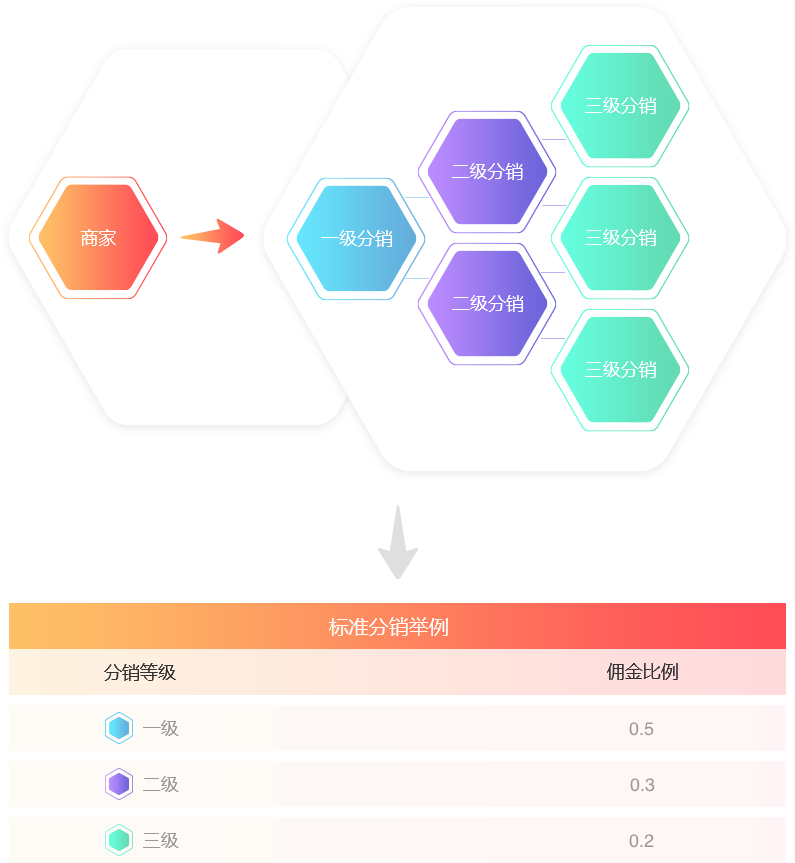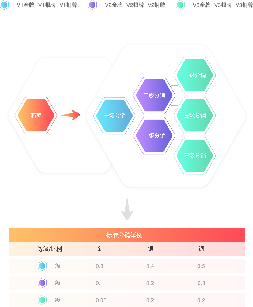 3x3分銷(xiāo)模式是在標(biāo)準(zhǔn)分銷(xiāo)的基礎(chǔ)上的升級(jí)版,把在每一級(jí)的分銷(xiāo)的基礎(chǔ)上,再劃分為金、銀、銅,三個(gè)等級(jí), 每個(gè)等級(jí)取的傭金上限不一樣,這樣分銷(xiāo)商在推廣的時(shí)候就變成了3x3=9個(gè)角色, 分銷(xiāo)商在推廣的時(shí)候按照對(duì)應(yīng)的級(jí)別比例獲取相應(yīng)的獎(jiǎng)勵(lì)。