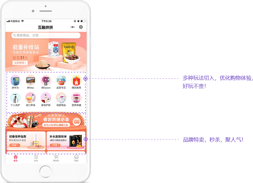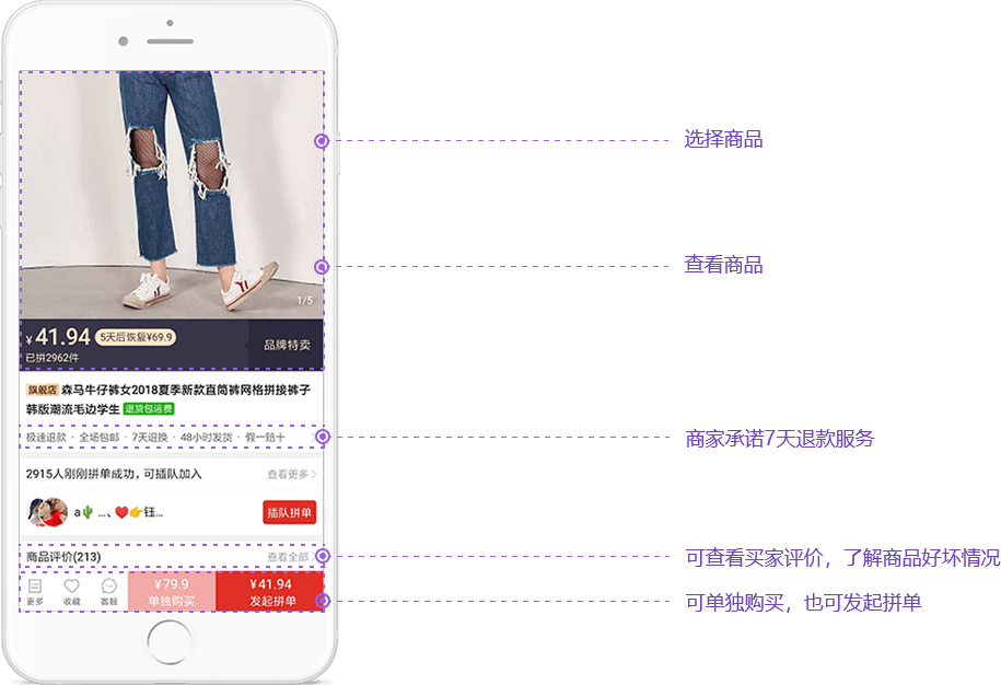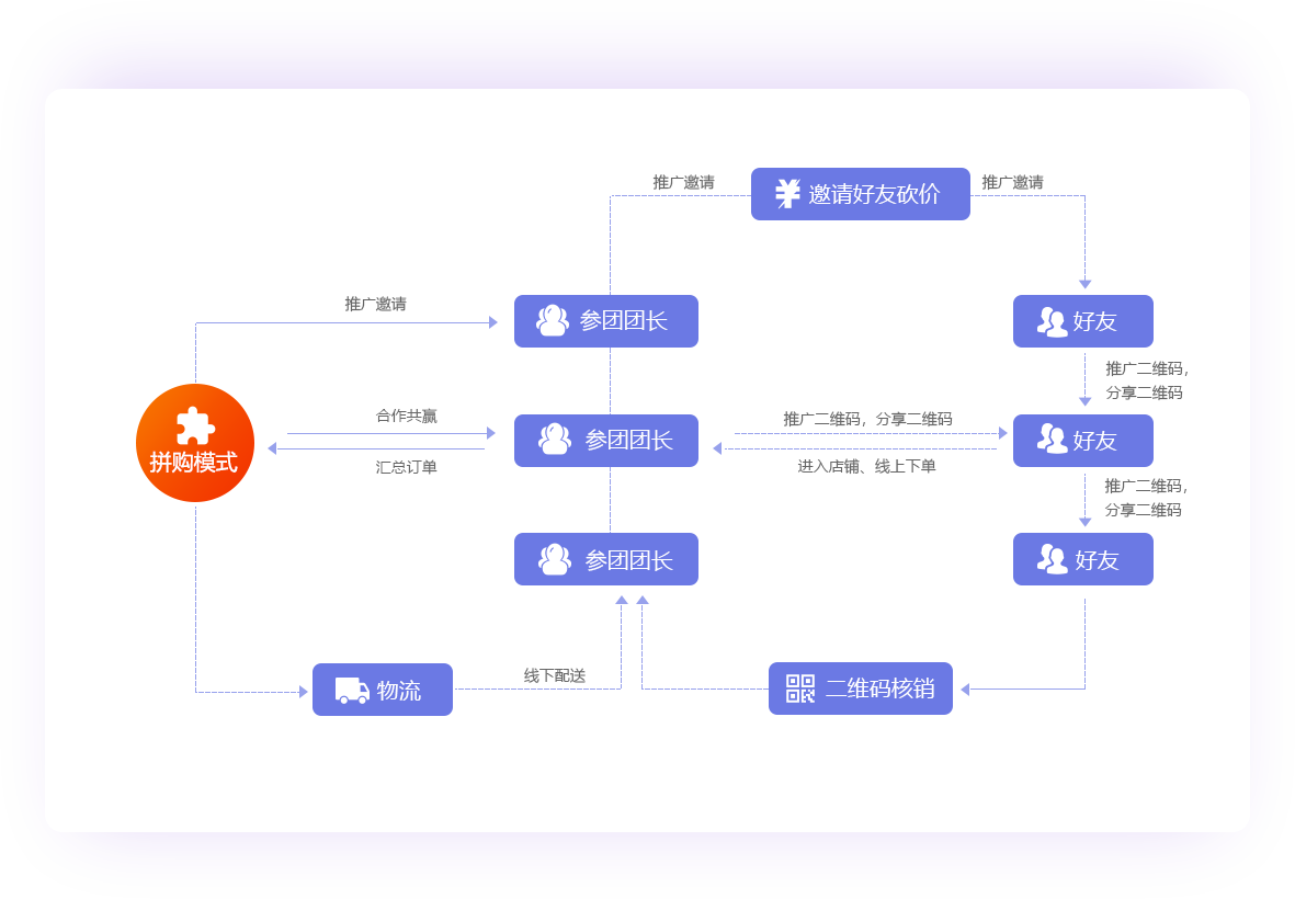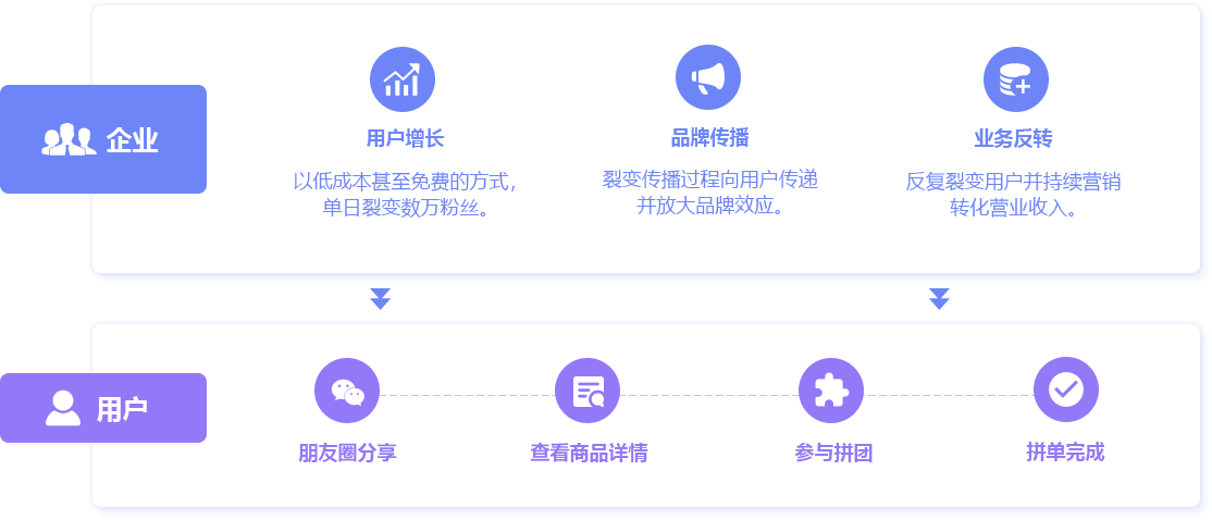 用戶拼團(tuán)砍價(jià),借助微信流量、社交電商分享化、產(chǎn)品用戶生命周期及小程序把用戶群下沉到三四線及以下城市, 并通過(guò)低門(mén)檻促銷(xiāo)活動(dòng)來(lái)抓住用戶、刺激用戶,將傳統(tǒng)的“人找貨”,轉(zhuǎn)變成了“貨找人”, 通過(guò)"拼"的模式,迅速裂變并聚集消費(fèi)需求,實(shí)現(xiàn)B2C向C2B的逆轉(zhuǎn),已此完成銷(xiāo)售裂變的電商模式。