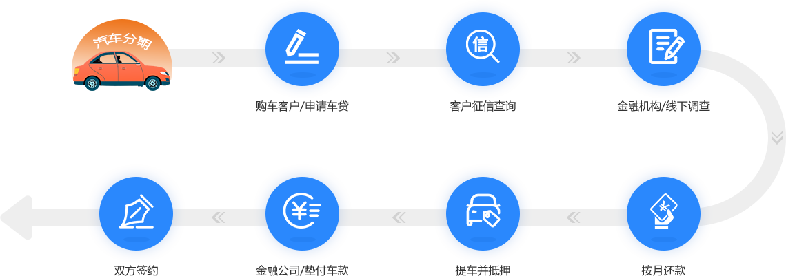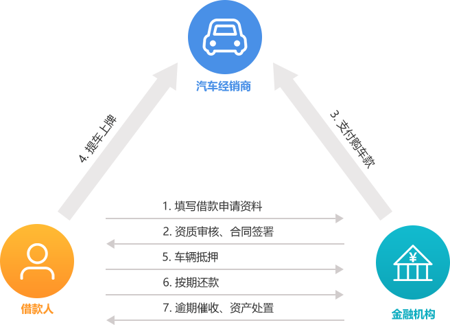 借款人向金融機(jī)構(gòu)提出借款申請(qǐng),通過(guò)資質(zhì)審核后,與金融機(jī)構(gòu)簽訂借款合同并支付首付款、保證金、服務(wù)費(fèi)等;金融機(jī)構(gòu)將購(gòu)車款項(xiàng)支付給汽車經(jīng)銷商,借款人提車上牌并將車輛抵押給金融機(jī)構(gòu);借款人按月還款給金融機(jī)構(gòu),還清貸款后向金融機(jī)構(gòu)申請(qǐng)贖回汽車所有權(quán)。
