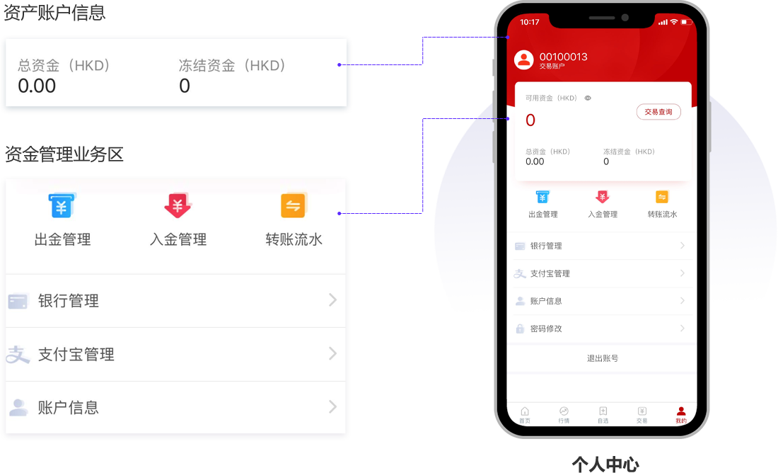 APP包括主要包括首頁、行情K線,交易區(qū),個人中心等主要功能。