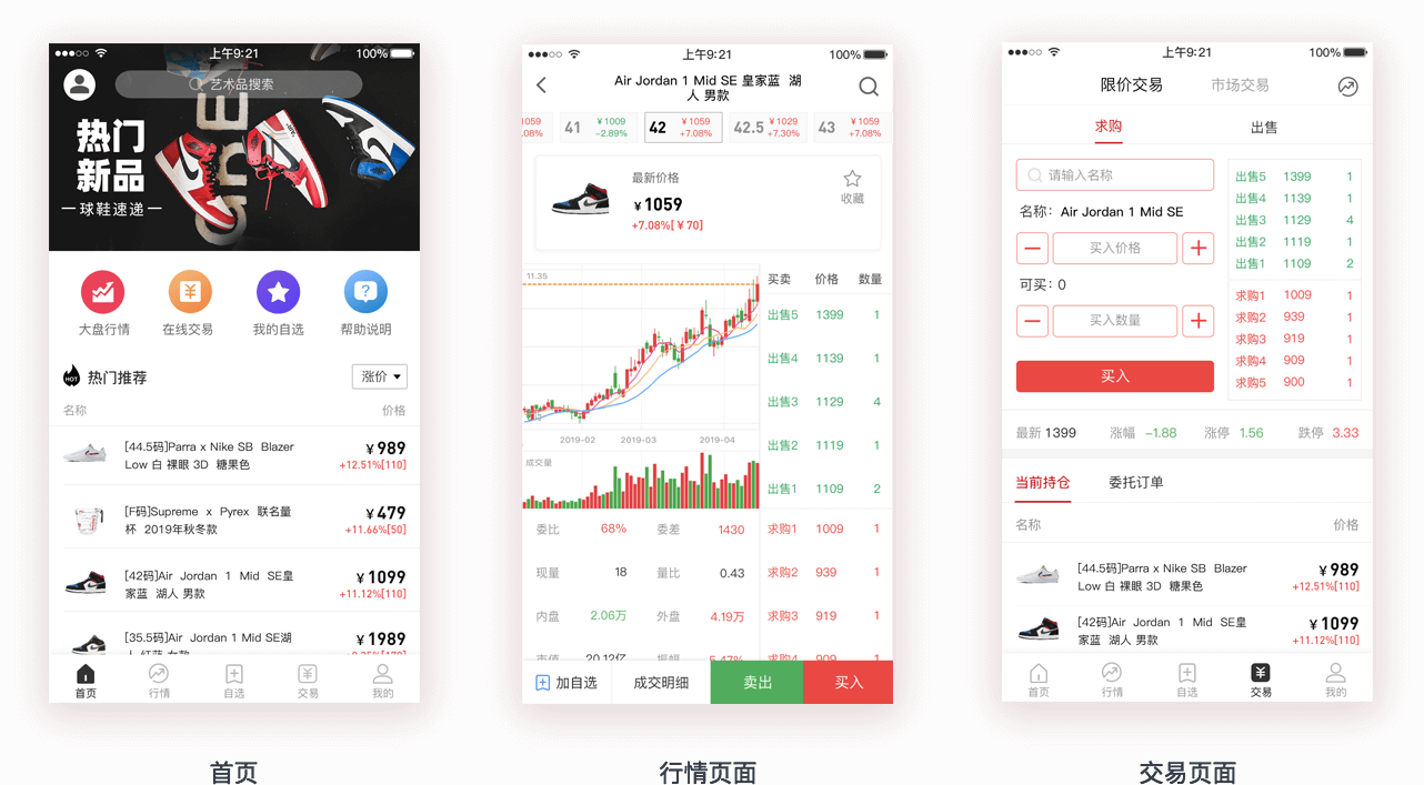 APP主要包含大盤行情、在線交易、自選、潮品K線、分時圖、包括限價/市價買賣