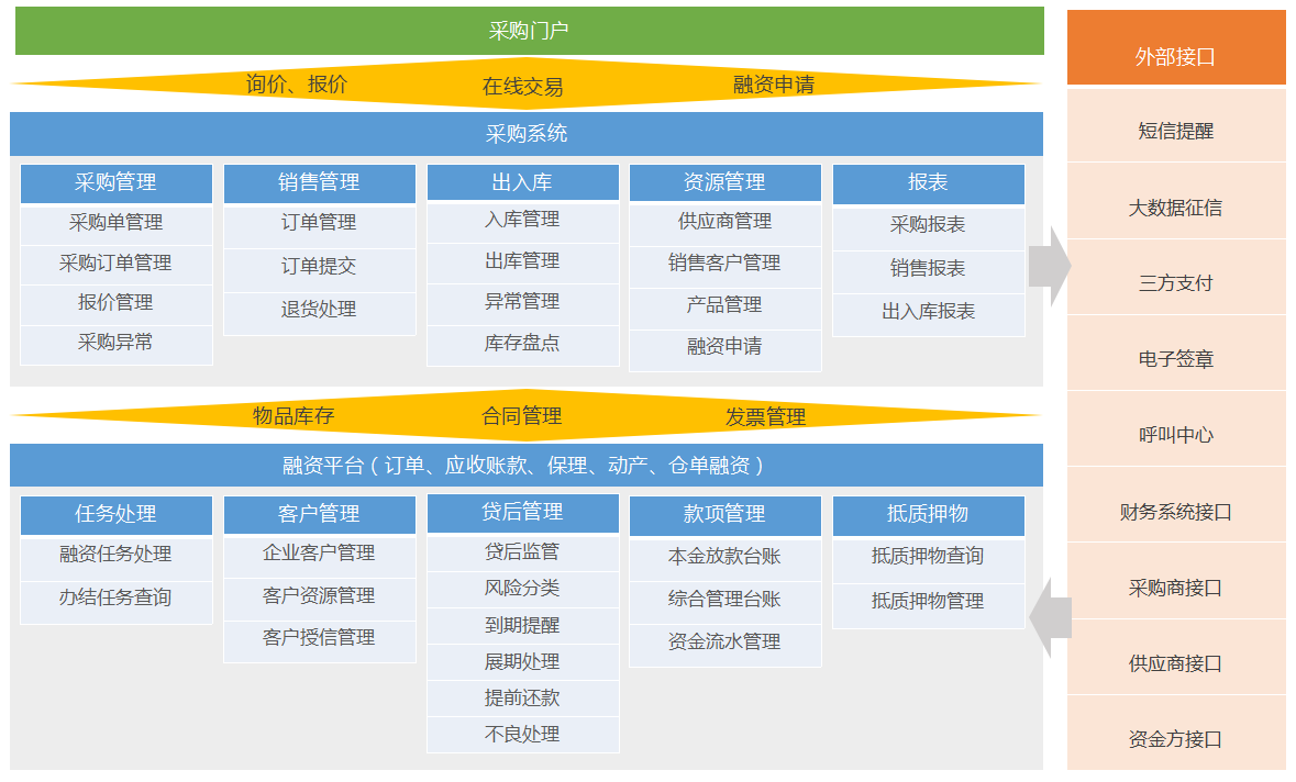 | 供應(yīng)商融資系統(tǒng)是一款集采購(gòu)、銷售、融資為一體的管理系統(tǒng),此系統(tǒng)主要針對(duì)的是融資用途為采購(gòu)備貨的場(chǎng)景。利用系統(tǒng)對(duì)整個(gè)環(huán)節(jié)的管理可以對(duì)其過(guò)往合同履行能力、供貨歷史、信用記錄進(jìn)行全面掌握,同時(shí)也能夠了解供應(yīng)商庫(kù)存情況、訂單、應(yīng)收應(yīng)付情況。供應(yīng)商可以通過(guò)訂單先進(jìn)行訂單融資,在收到發(fā)票和入庫(kù)單后可以進(jìn)行應(yīng)收賬款融資,客戶支付貨款后,即可解除應(yīng)收賬款融資;也可以直接進(jìn)行倉(cāng)單融資,并且支持融資款可以通過(guò)支付通道直接付給上游供應(yīng)商或原材料提供商,順利供貨。此款系統(tǒng)不但可以支持企業(yè)獨(dú)立運(yùn)營(yíng)一整套平臺(tái), 還可以與采購(gòu)平臺(tái)、融資平臺(tái)等合作,通過(guò)接口形式提供交易數(shù)據(jù)、庫(kù)存數(shù)據(jù)等,以便為其提供融資服務(wù)。 |