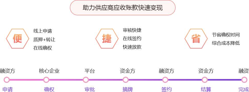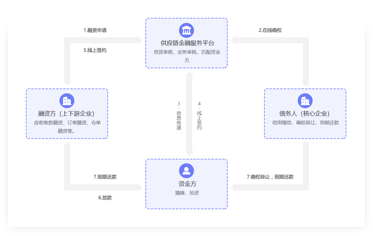 N+核心企業(yè)、N+上下游企業(yè)、N+資金方參與,線上發(fā)布、確權、摘牌、簽約,幫助融資方快速解決融資難題