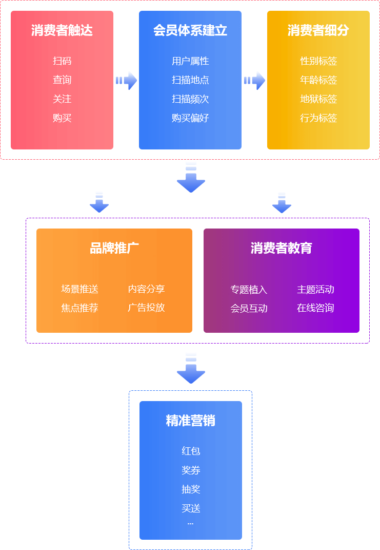 滿足政府監(jiān)管要求的同時(shí),為品牌商提供消費(fèi)者觸達(dá)、會(huì)員體系建立、消費(fèi)者細(xì)分、品牌推廣、消費(fèi)者教育、精準(zhǔn)營(yíng)銷等營(yíng)銷增值服務(wù)。