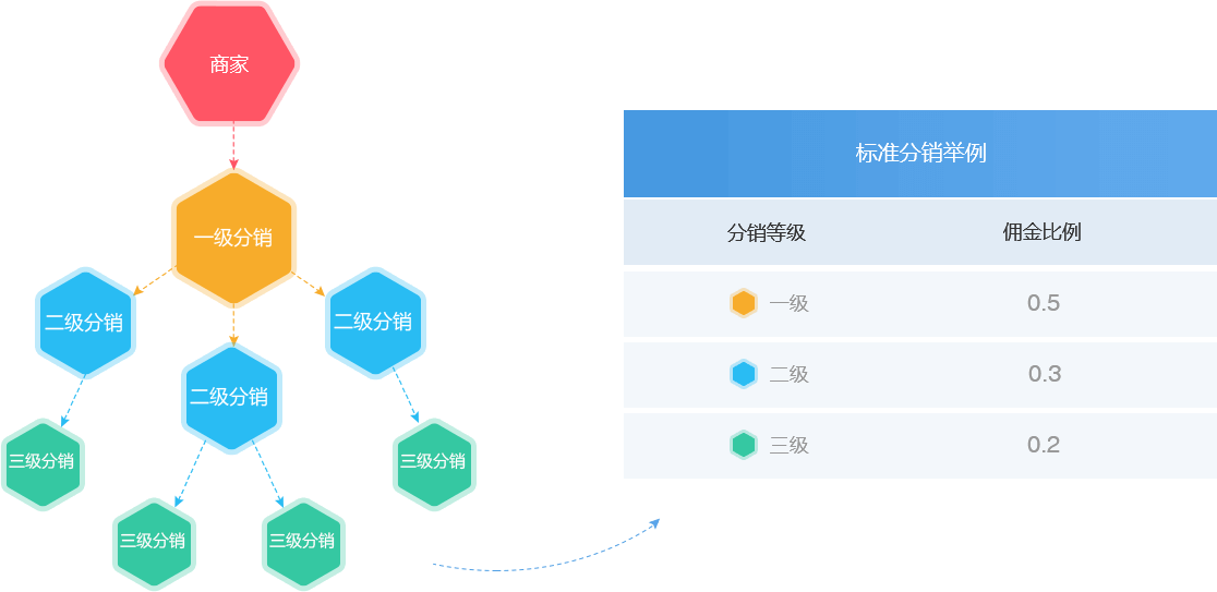 3x3分銷模式是在標(biāo)準(zhǔn)分銷的基礎(chǔ)上的升級版,把在每一級的分銷的基礎(chǔ)上,再劃分為金、銀、銅,三個等級,每個等級取的傭金上限不一樣,這樣分銷商在推廣的時候就變成了3x3=9個角色,分銷商在推廣的時候按照對應(yīng)的級別比例獲取相應(yīng)的獎勵。