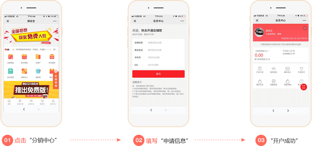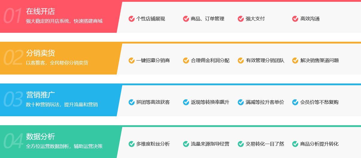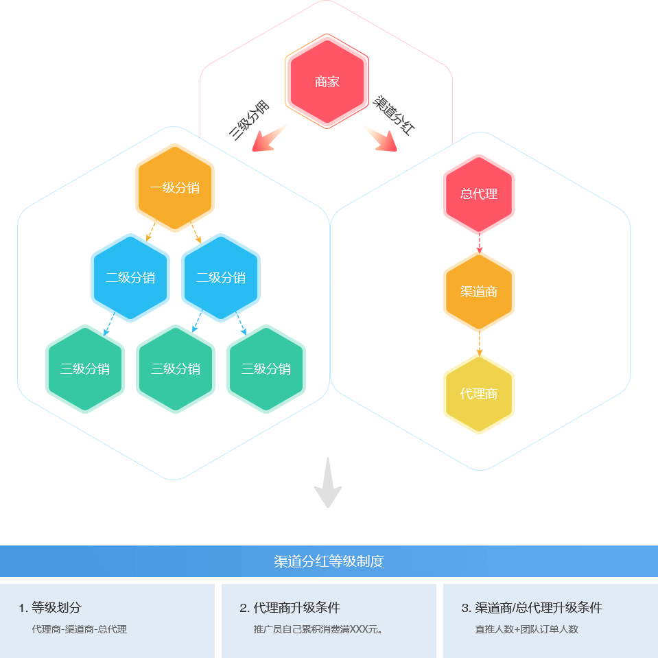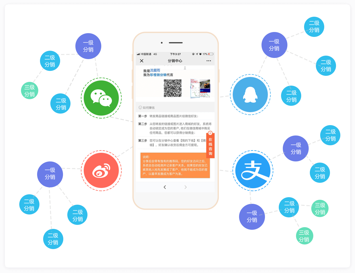 用戶最多可發(fā)展三級分銷、無限裂變、快速獲取用戶,統(tǒng)一銷售和管理