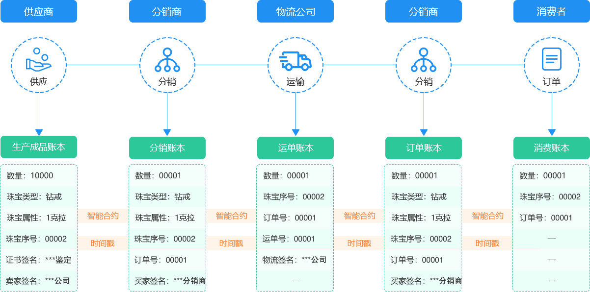 利用API對(duì)接企業(yè)內(nèi)部業(yè)務(wù)系統(tǒng),通過智能合約實(shí)現(xiàn)商品數(shù)據(jù)在生產(chǎn)、物流、倉儲(chǔ)、分銷、零售、監(jiān)管等環(huán)節(jié)直接上鏈