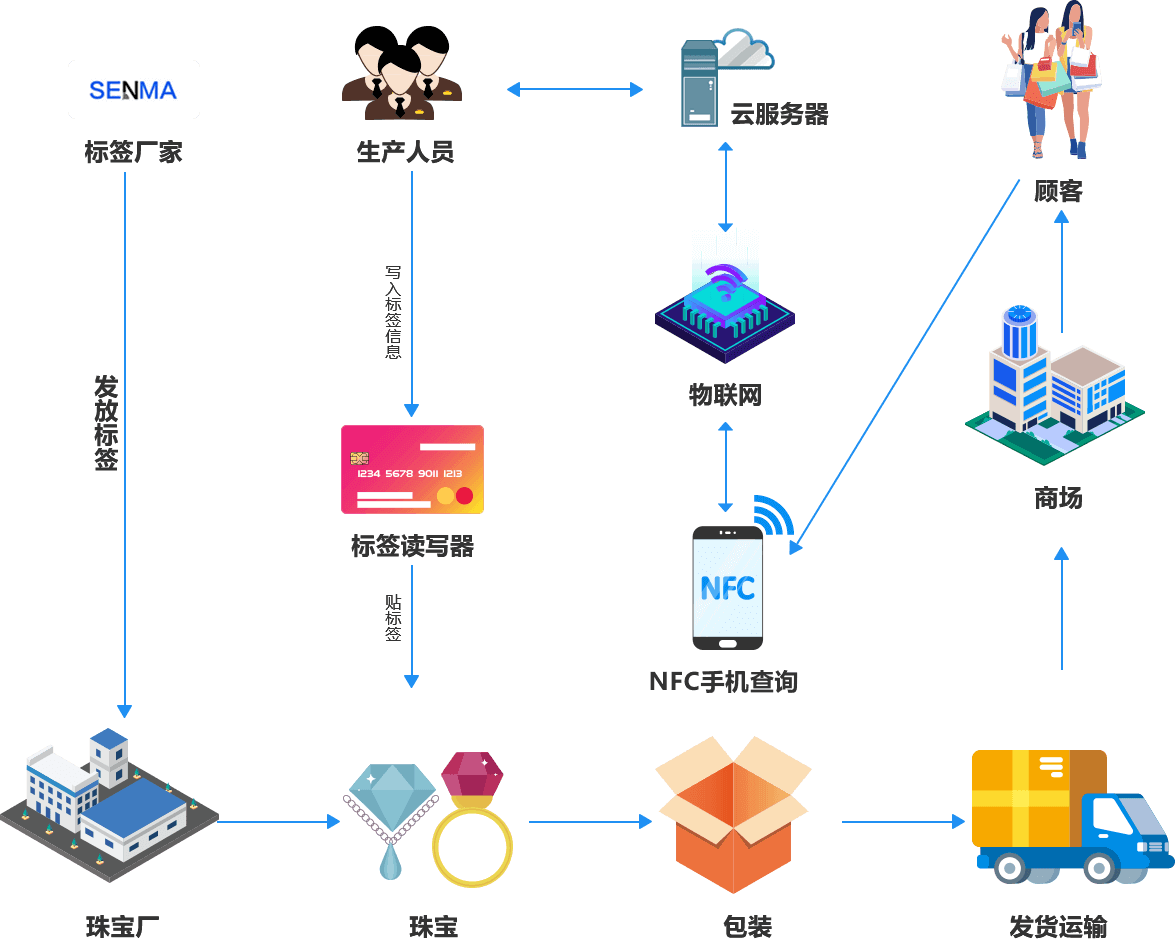 通過近場通信芯片(NFC)把數(shù)字ID和實(shí)際商品建立物理連接關(guān)系;