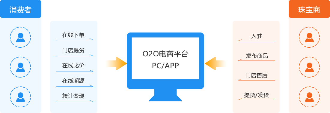 考慮珠寶行業(yè)的特殊性,搭建線上線下結(jié)合的O2O珠寶電商平臺(tái),可以在線比價(jià)、在線查溯源、在線下單,線下門店提供線下提貨、售后等服務(wù),當(dāng)然也可以自由選擇線上發(fā)貨。