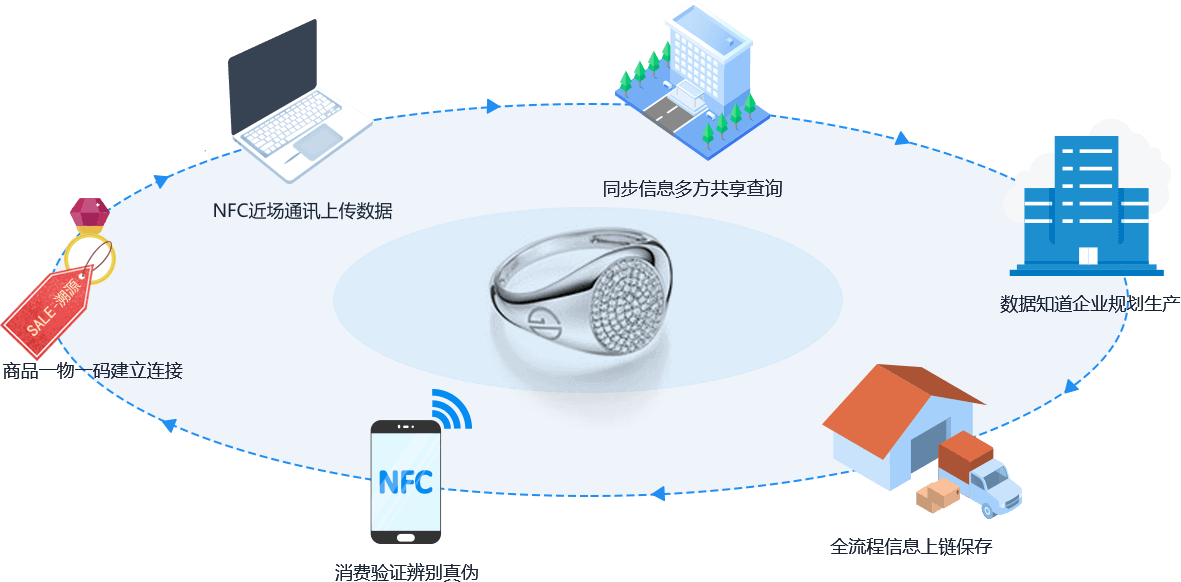 作為連接數(shù)據(jù)中心和NFC防偽標(biāo)簽的通道,給最終消費(fèi)者權(quán)限的防偽查詢體驗(yàn);手機(jī)連接網(wǎng)絡(luò),靠近貼有NFC防偽標(biāo)簽的珠寶,即可馬上知道珠寶的真?zhèn)涡畔ⅰ?/p>