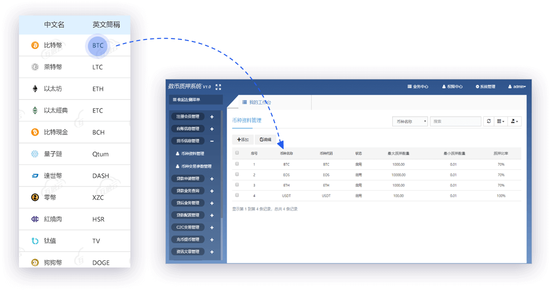 目前已經(jīng)接入100余種幣種,下圖展示的只是其中的一小部分。管理系統(tǒng)后臺有添加修改幣種的功能,客戶可根據(jù)自己的運營需求自由添加幣種資料。