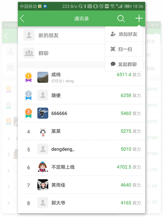 根據(jù)用戶數(shù)據(jù),將好友圈的算力排行由高到底展示,通過激發(fā)用戶的競(jìng)爭(zhēng)意識(shí)來提高用戶參與度